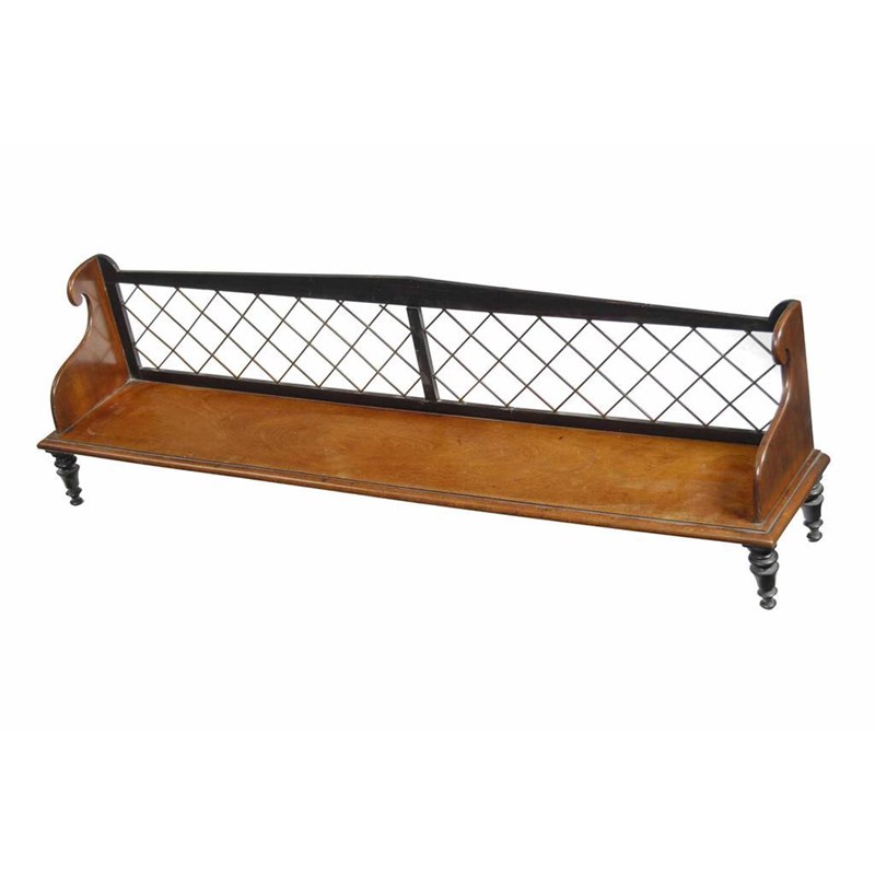 A Victorian mahogany and ebony bookstand, with shaped sides and a brass grille back, on turned tapering supports, 12.5in (31.4cm) h, 43in (109.5cm) w, 7.75in (19.6cm) d.