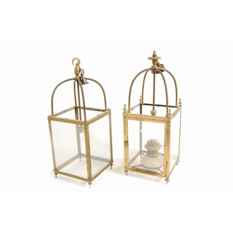 Two similar brass hall lanterns, one with urn finials and fitted with an oil lamp, the other with reeded decoration, early 20th century and later, 25.5in (64.6cm) h, 9.5in (24cm) w, max. (2)