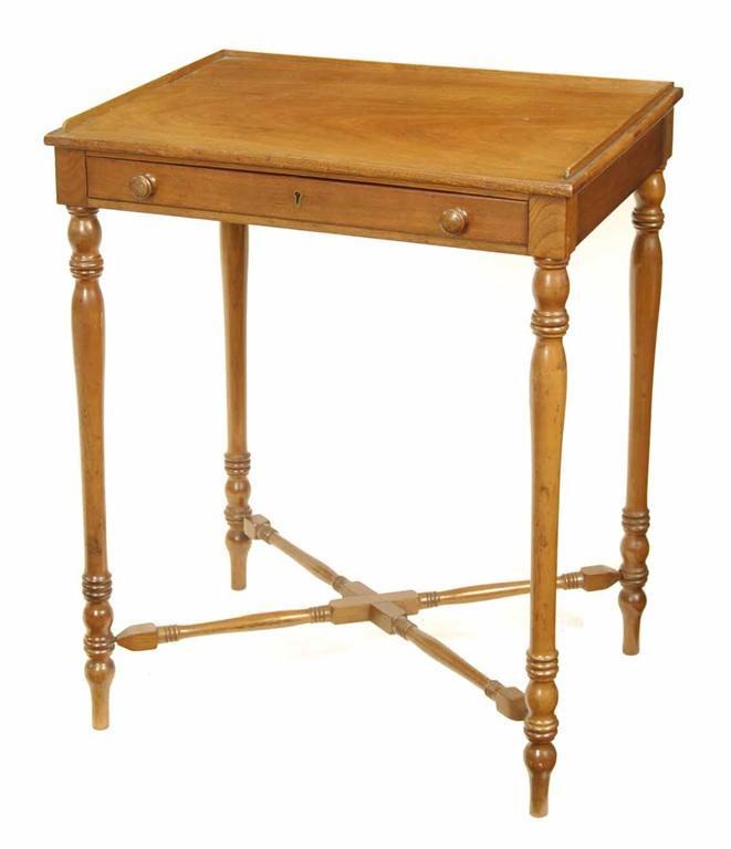 A Victorian walnut 'Campaign' table by Richard Pullen, the three quarter gallery to a frieze drawer, the base with the remains of a paper label 'RICHARD PULLEN, CABINET MAKER & WOOD CARVER, FARNHAM SURREY', on turned tapering legs united by an 'X' stretcher, 29.5in (75cm) h, 24in (60.7cm) w, 18in (45.4cm) d. The handles, legs and feet all unscrew, with numbers to the stretcher, legs and underside of the table. H & R Pullen are recorded as chairmakers in Farnham, Surrey c.1838, see Dictionary of English Furniture Makers 1660-1840.