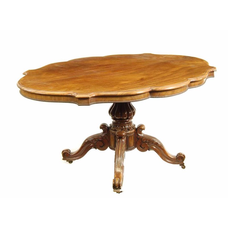 A Victorian mahogany breakfast table, the serpentine moulded edge top above a lobed baluster stem and carved scroll supports and brass castors, 29in (73.5cm) h, 59.75in (152cm) w, 44.5in (113cm) d.