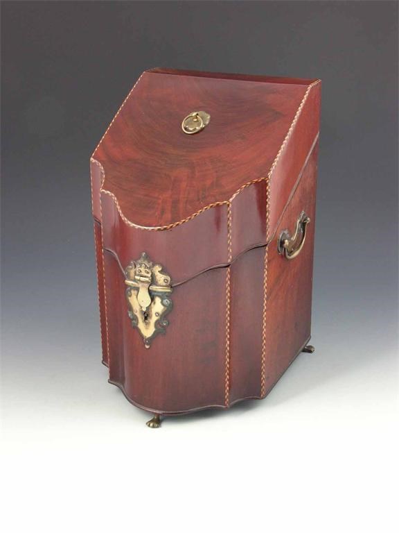 A 19th century mahogany serpentine front knife box, with chevron edging and a vacant interior, 12.5in (32cm) h, 7.75in (19.6cm) w, 9in (23cm) d.