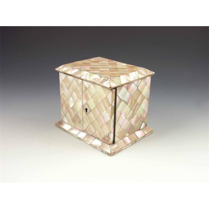 A Victorian mother of pearl dressing table chest, with all over quilt effect and a pair of ivory edged doors and three sycamore fronted drawers, with silk and plush linings, 6.25in (16cm) h, 7.5in (19cm) w, 6in (15cm) d.