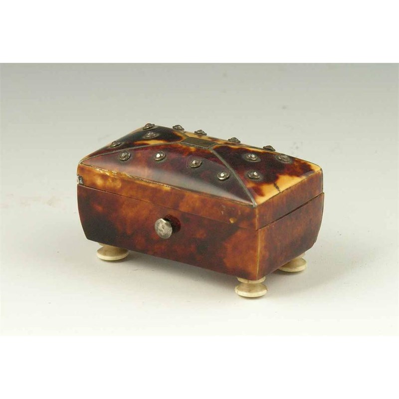 A late 19th century miniature tortoiseshell box, with a hinged cover having pewter stringing and applied steel prunts, on turned ivory feet, 1.25in (3cm) h, 2in (5cm) w.