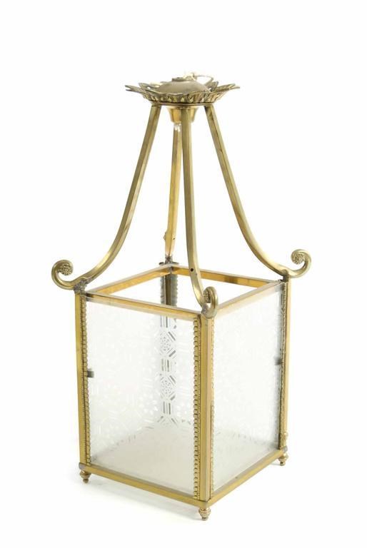 A brass hall lantern, with etched glass panels, early 20th century, previously fitted for gas, 23.25in (59cm) h, 10.5in (26.5cm) w.