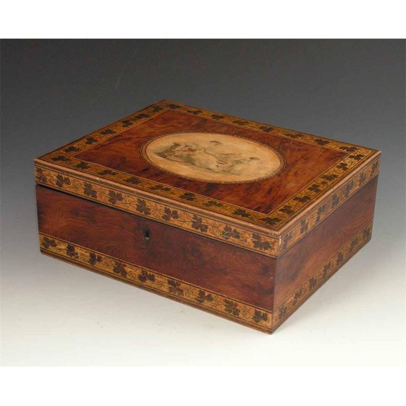 A Regency yew wood work box, the hinged lid with an oval panel inset an engraving of a mother and child, with vine leaf borders, the interior with a divided lift-out tray, 4.25in (10.5cm) h, 10.75in (27.4cm) w, 9in (22.3cm) d. With key.