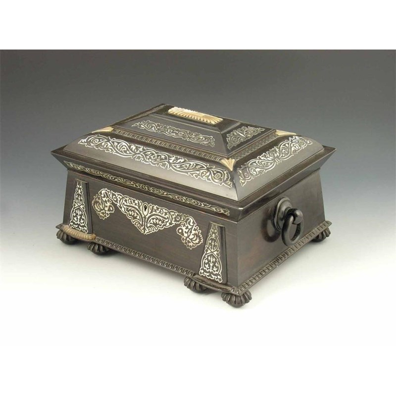 A William IV ebony and mother of pearl inlaid sewing box, of sarcophagus shape, the hinged lid fitted a letter pouch, to a divided lift-out tray with pink watered silk lids and covers and two button hooks, with ring handles and lobed bun feet, 7.75in (19.5cm) h, 13.5in (34cm) w, 10.5in (26.7cm) d. Some losses to inlay.