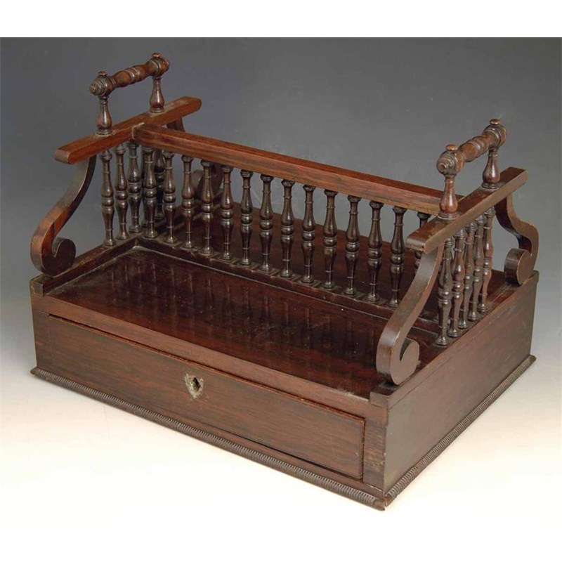 A George IV rosewood double sided book carrier, with turned handles above scroll supports and a baluster turned spindle gallery, to a drawer and a reel moulded edge, 10in (25.2cm) h, 14.25in (35.7cm) w, 10.75in (27.5cm) d. Old damages, cracks and replacements, key escutcheon off but present.