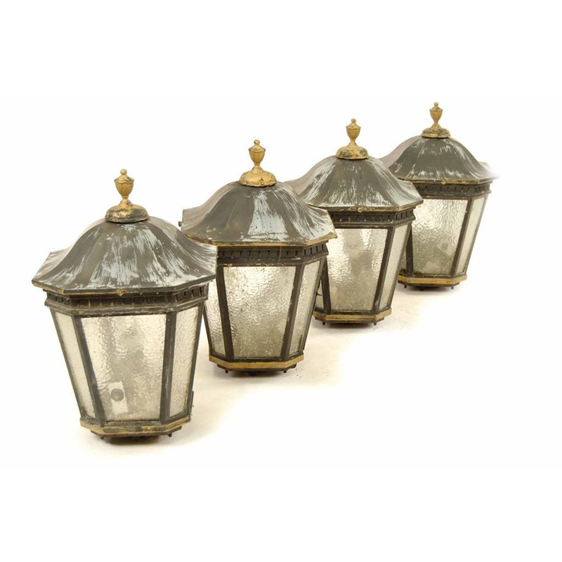A set of four painted copper and glass lanterns, each with an urn finial, 24in (60.8cm) h, 15.5in (39.5cm) w, 15in (38cm) d. (4)