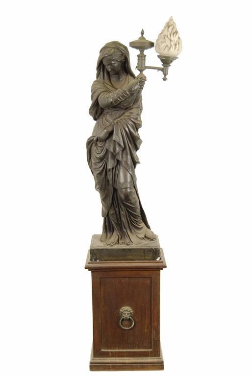 A Regency black painted plaster torchere by Robert Shout, Holborn, modelled as a classical maiden holding a brass lamp, the base inscribed 'R. Shout, Holborn', on a later oak plinth, the figure with lamp: 45in (114.5cm) h, 14in (36cm) w, 10in (25.5cm) d, the figure and plinth: 68.75in (174.6cm) h. Old chips and losses.
