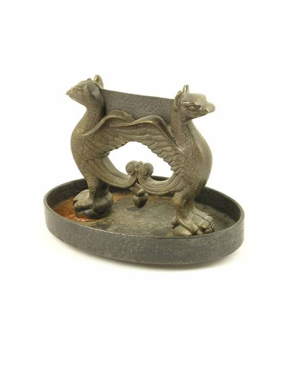 A Regency bronze and cast iron boot scraper, in the form of twin griffin, to an oval base, 10in (25.5cm) h, 13.25in (33.5cm) w, 8.5in (21.6cm) d.