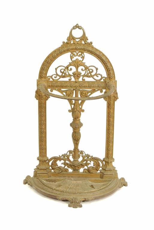 A Victorian cast iron stick stand, with later gilt decoration, 35.5in (90cm) h, 22.75in (58cm) w, 13in (33cm) d. Worn.