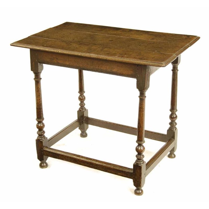 A Queen Anne oak side table, the moulded edge boarded top above slender baluster turned supports united by peripheral stretchers, 26in (66.2cm) h, 30in (76cm) w, 19.5in (49.6cm) d.