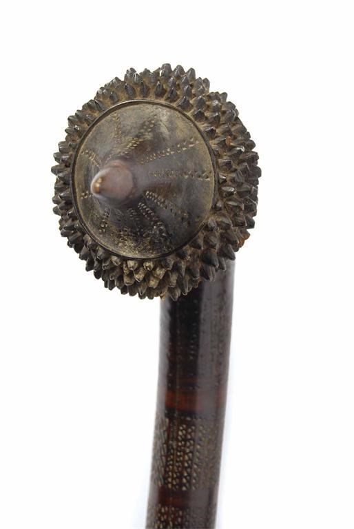 A Fiji wood 'pineapple' club, totokia, with a slightly curved handle having bands of zig-zag decoration with a circular head with nine bands of small spikes and a central spike, 39in (99cm) l.