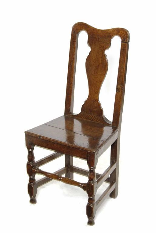 An early 18th century oak backstool, the vase shape splat to a solid seat on turned and block supports united stretchers.