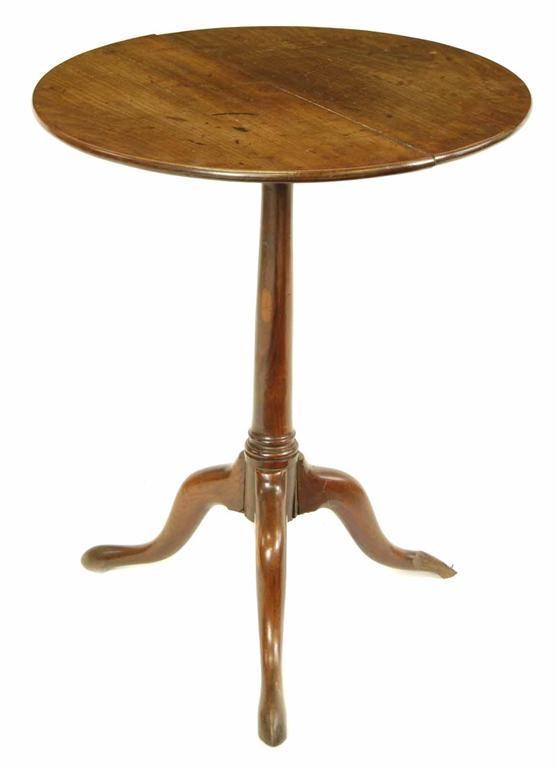 A tripod table, the circular mahogany tilt-top on a yew wood base with a turned stem and cabriole legs, 18th century but top and base associated, 27in (68.8cm) h, 22.75in (57.5cm) dia. Top cracked, damages to legs and feet.