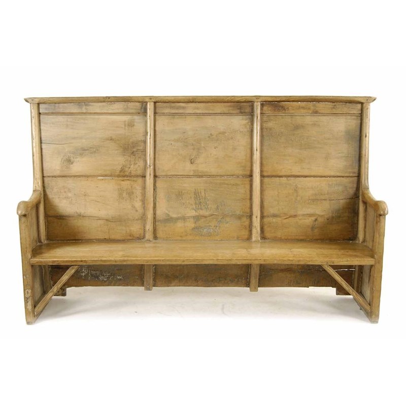 A 19th century ash and beech settle, previously painted, 49.25in (125cm) h, 83in (211cm) w, 20in (51cm) d.