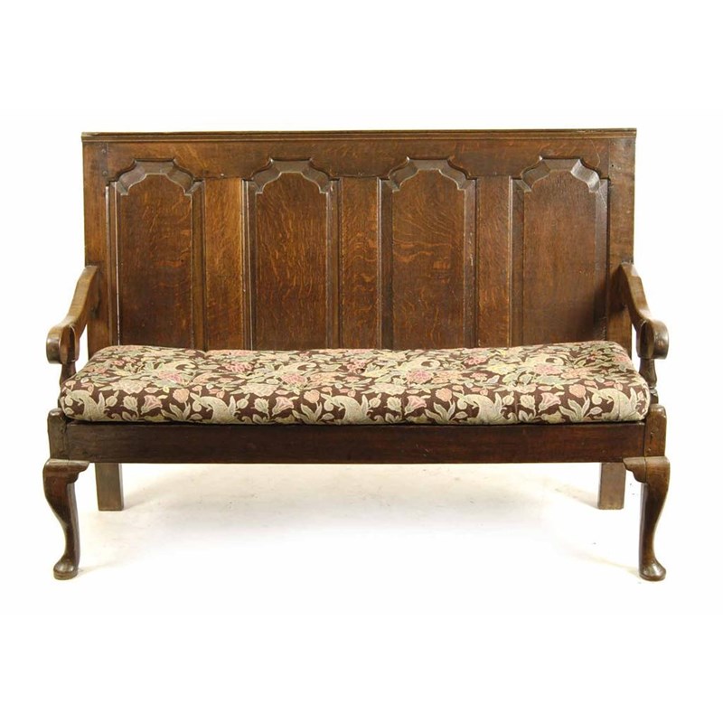 A mid 18th century oak settle, the quadruple fielded panel back to a later squab cushion and a webbed seat, on cabriole front legs and pad feet, 41.5in (105.6cm) h, 59.75in (151.5cm) w, 19.75in (50cm) d.