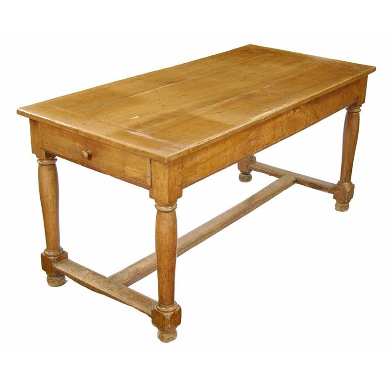 A French cherrywood farmhouse table, the cleated planked top above a frieze drawer either end on turned supports and bun feet united by a central stretcher, 19th century, 28.25in (71.6cm) h, 57.5in (145.8cm) w, 27.25in (69cm) d. Old worm holes, scratches to top, old wear.