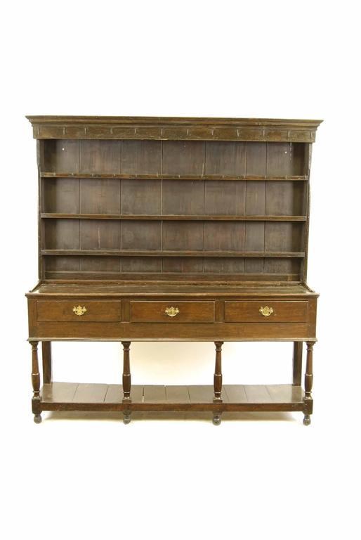 An early 19th century oak pot-board dresser, the shelved back having iron hooks above three frieze drawers fitted replaced brass plate handles, on column supports and bun feet, South Wales, 77.75in (197.2cm) h, 77in (185.2cm) w, 16.25in (41.4cm) d.