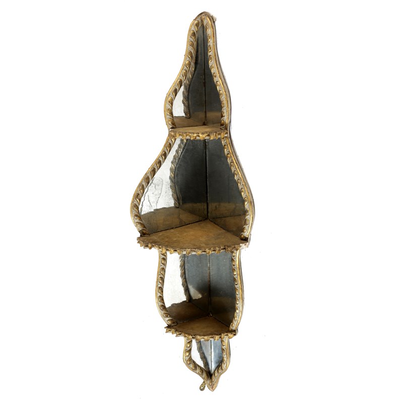 the three graduated, mirror-backed tiers, with gadrooned frames and gilt gesso rocaille shelf edges