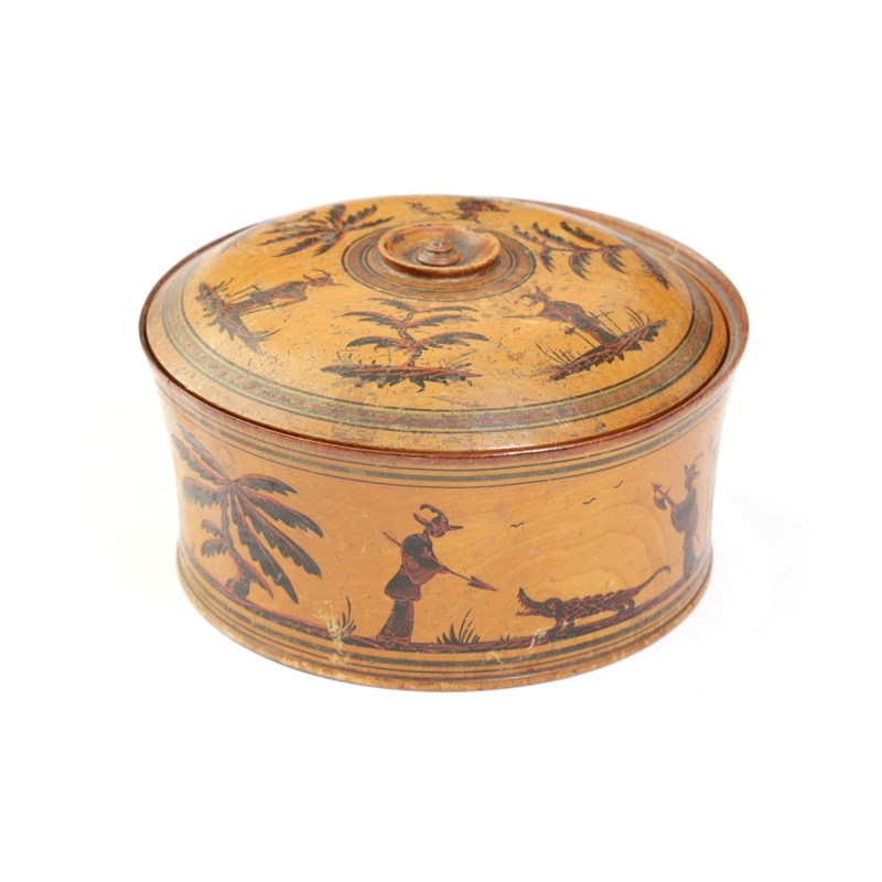 of circular form, black and red painted with figures hunting a crocodile among trees, with the remains of a paper lining