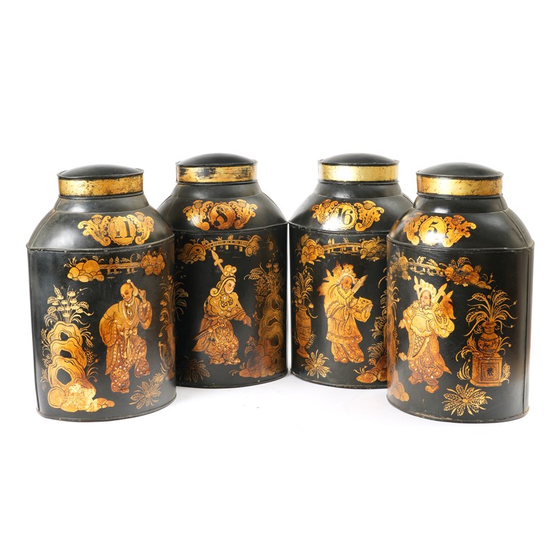 A SET OF FOUR VICTORIAN BLACK JAPANNED TOLE TEA CANISTERS