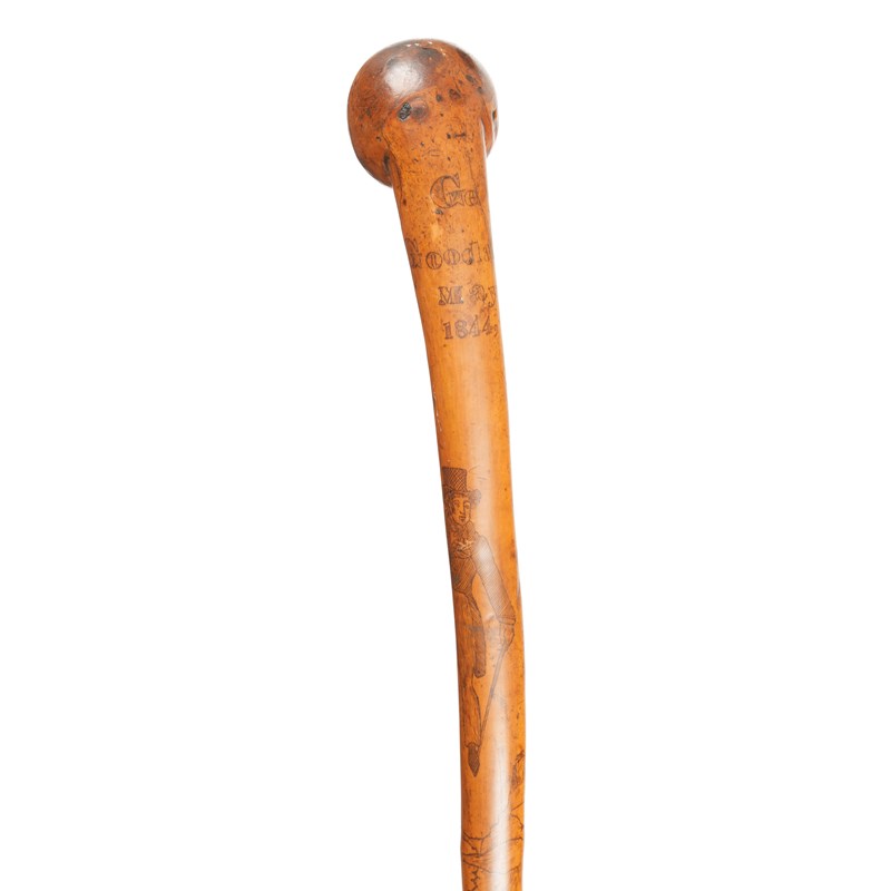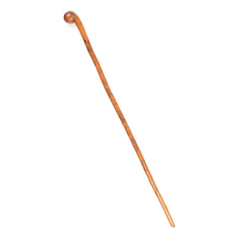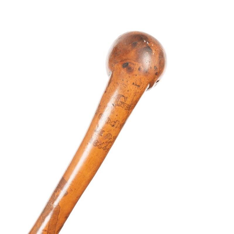 AN EARLY VICTORIAN FRUITWOOD AND PENWORK WALKING CANE