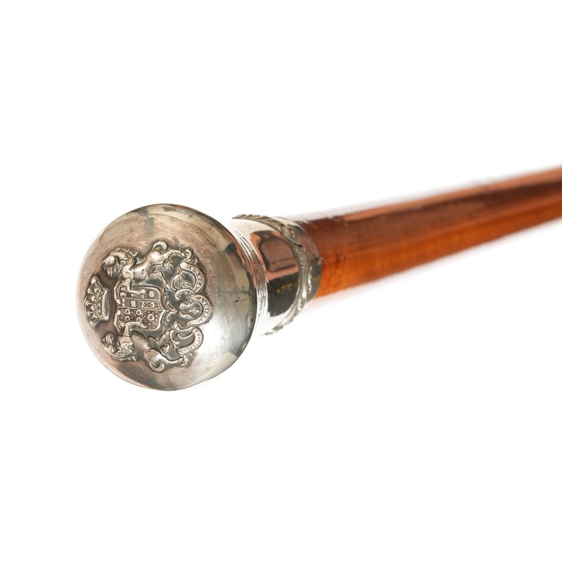 each with a silver handle, the top with a coat of arms for Hugh Lowther, 5th Earl of Lonsdale (d.1944), hallmarked London 1878 with a Malacca shaft and a white metal ferrule (2)