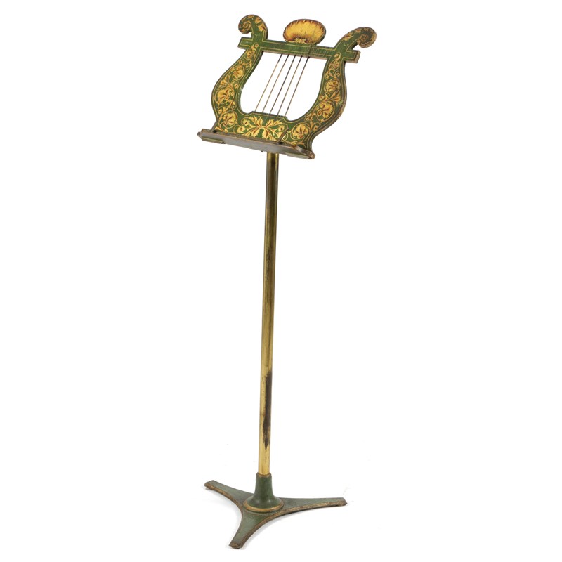 decorated in gilt with scrolling leaves and a central scallop shell, the lyre shape rest on an adjustable brass stem