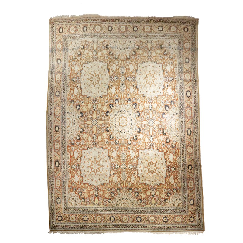 the tan field centred by flowerhead medallion surrounded by four further medallions and half medallions, framed by spandrels and borders of rosettes and serrated leafy floral vines, flanked by meandering vine and carnation guard stripes