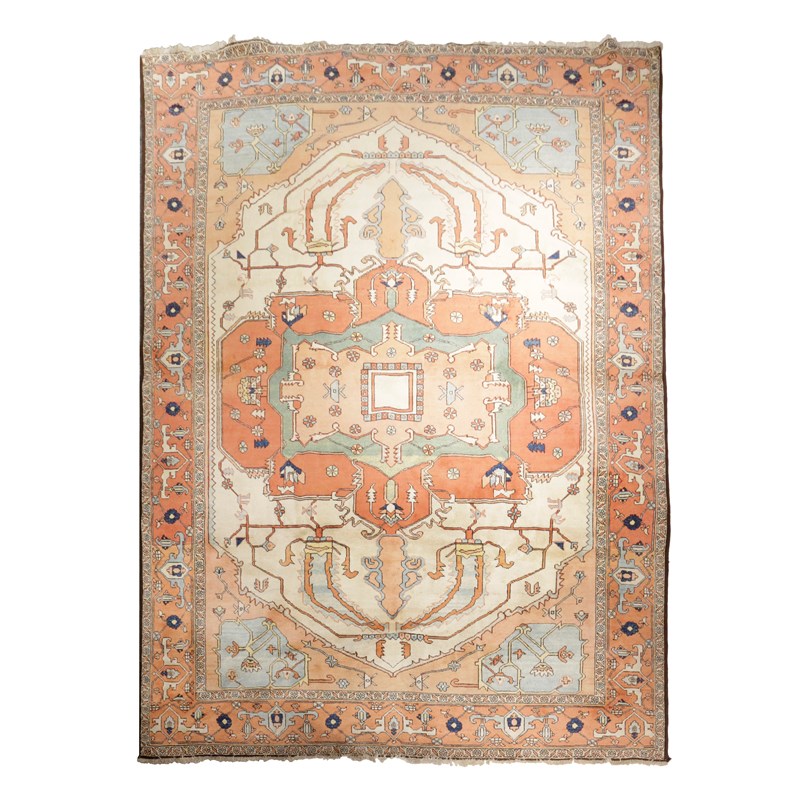 the ivory field of large serrated leaves and angular vines centred by a pale terracotta and mint medallion enclosed by spandrels and terracotta borders of samovar motifs flanked by carnation guard stripes