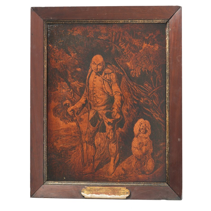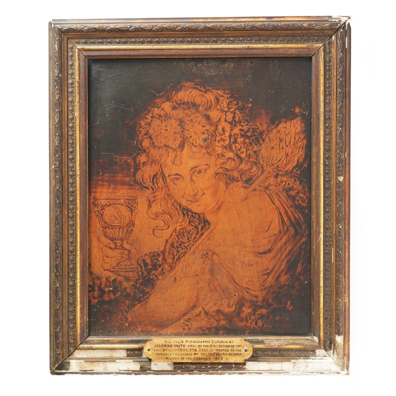 Both frames have a plaque inscribed 'These three pyrographic pictures by Jeremiah Smith part of the Collection of the late Mr Alfred Bilton, were presented to the Company by his friend Mr Walter Henry Harris Master of the Company, 1902-9'.