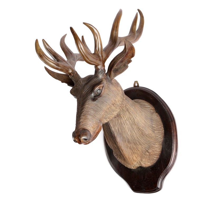 A BLACK FOREST CARVED AND PAINTED LINDEN WOOD STAGS HEAD