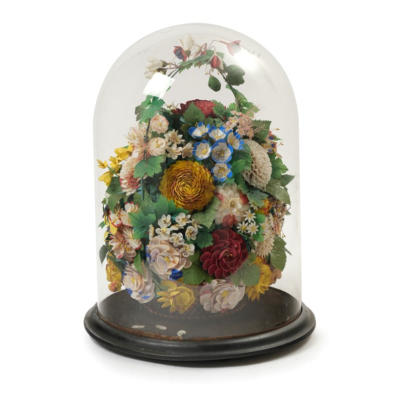 showing a variety of flowers in coloured shells interspersed with foliage, under a glass dome on a circular ebonised base