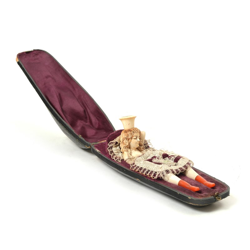 modelled as a lady reclining with her left arm behind her head, her legs being the cheroot holders, the velvet lined case forming her bed