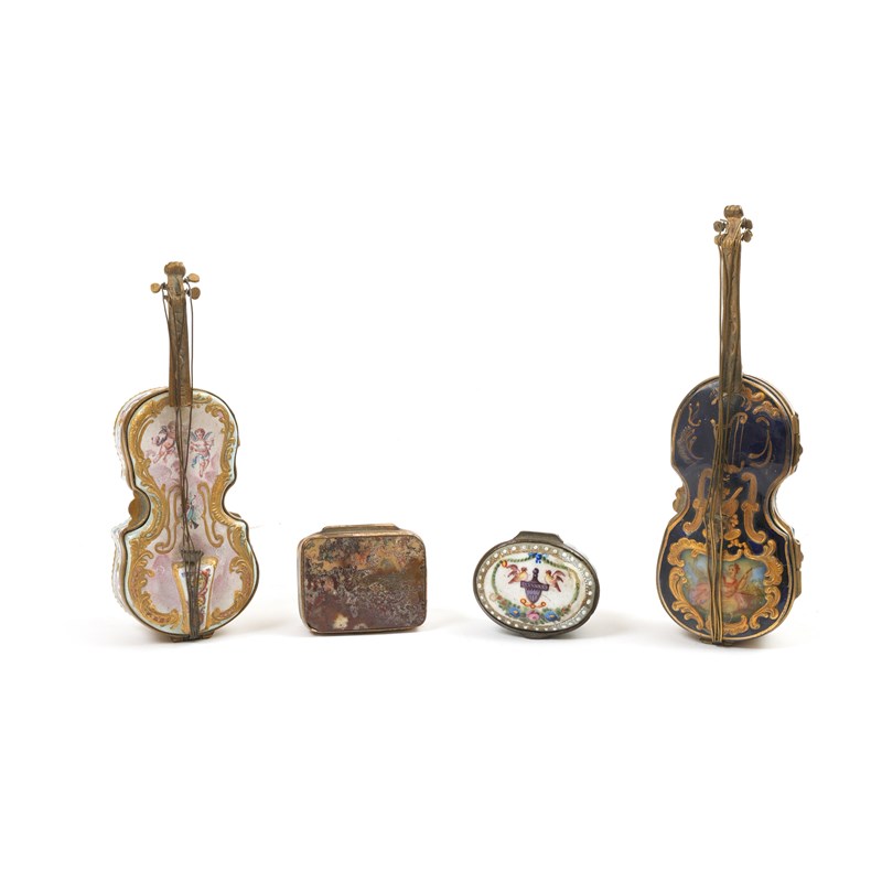 in the form of a violin or cello, with painted and gilded decoration, another similar German porcelain example, an enamelled oval snuff box, possibly Battersea, with a scene of two love birds on an urn and an agate and gilt metal snuff box (4)