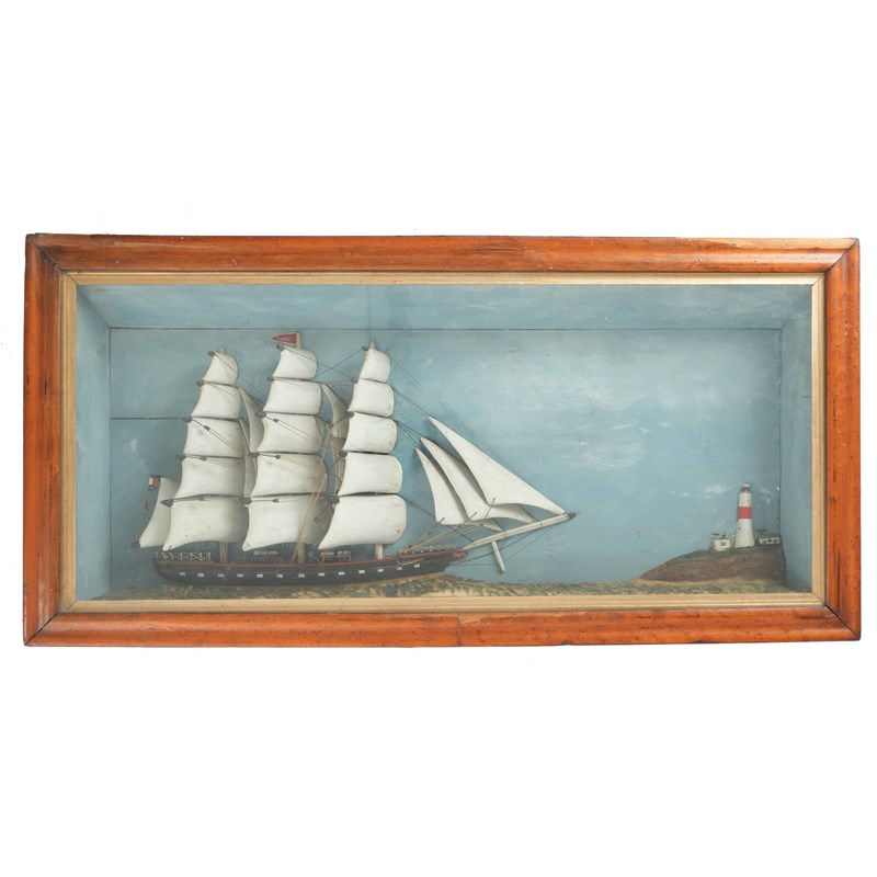 depicting a three masted schooner titled 'Annie' sailing towards an island lighthouse, in a glazed bird's eye maple box frame
