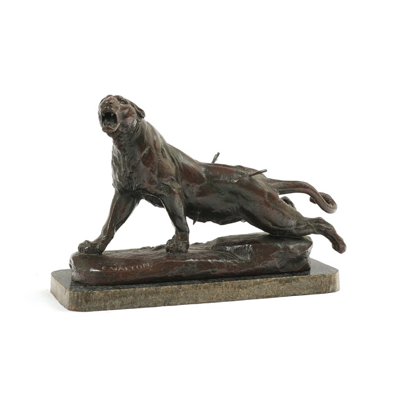 A FRENCH BRONZE ANIMALIER MODEL OF A WOUNDED LIONESS