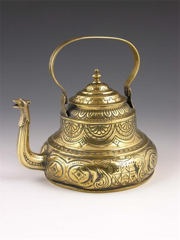 An 18th century Dutch embossed brass tea kettle, the body with all over decoration including a coat of arms and a shielded crest with swing handle, 9.5in (24cm) h.