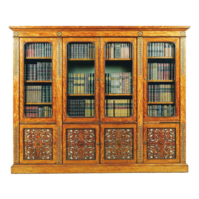 A William IV satinwood and marquetry bookcase, inlaid with bird's eye maple flower heads and stylized acanthus, the detachable cornice above three sections, the centre with a pair of glazed doors, flanked by single doors, enclosing adjustable shelves to cupboards below with foliate fret panelled doors, on a plinth base, 71.5in (181.5cm) h, 87.75in (222.8cm) w, 15.75in (40cm) d. One door lacking glass, damages to mouldings.