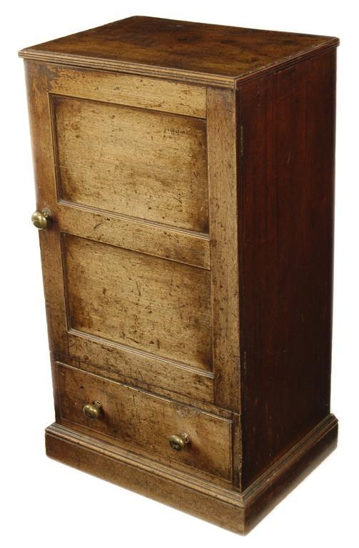 An early 19th century mahogany dining room pedestal plate warmer, the reeded edge top above a panelled door enclosing a metal lined warming interior with two shelves, with a drawer below fitted a metal box, 37.75in (95.7cm) h, 20.5in (52.2cm) w, 15in (38.1cm) d. Damages.