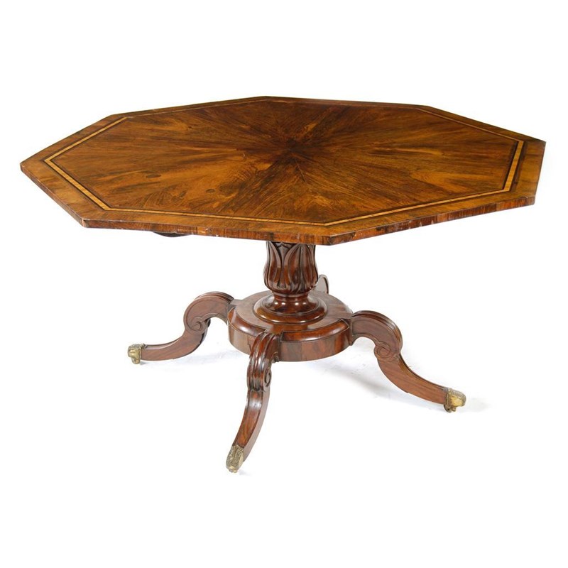 A George IV rosewood breakfast table, the octagonal tilt-top with segmented veneers and banded with satinwood and purple heart, the goncalo alves base with a leaf carved stem and four moulded scroll supports terminating in foliate cast brass caps and castors, stamped 'I R', 28.25in (71.7cm) h, 55.25in (140.3cm) w. Block and bearers are later replacements, old breaks and repairs to legs.