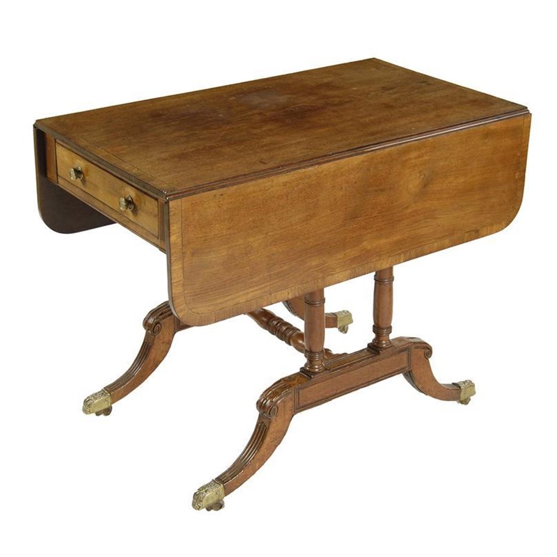 A Regency mahogany supper table, inlaid stringing, the drop-leaf top crossbanded in rosewood above a frieze drawer, faux to the reverse, on turned pillar supports and reeded downswept legs terminating in foliate cast brass sabots and castors, 28.5in (72cm) h, 36 x 40.5in (91 x 102.5cm) open. Restoration.
