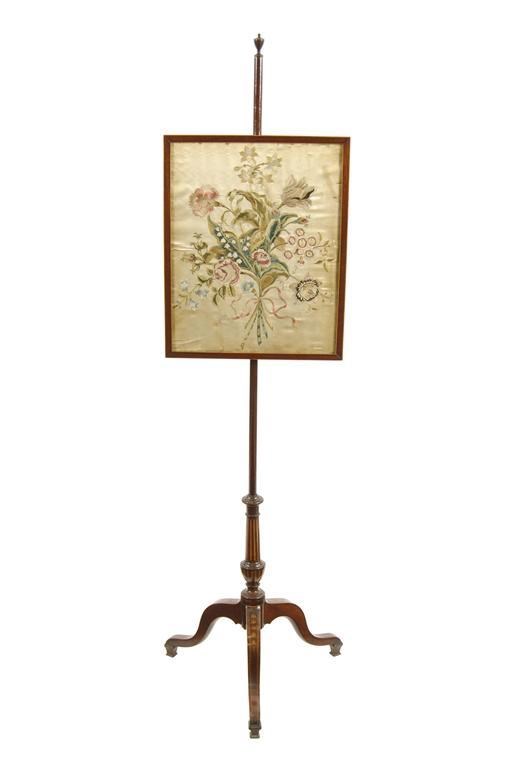 A late George III mahogany and inlaid pole firescreen, with an adjustable embroidered silk work panel, 58.5in (148.5cm) h. Minor old damages.