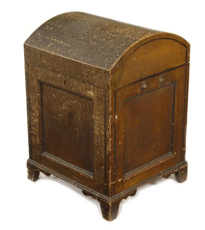 An early 19th century painted pine domed trunk, the interior with a hinged compartment to the lid, previously with carrying handles, 26.25in (66.5cm) h, 18.5in (46.5cm) w, 18in (45.6cm) d. Losses and degradation.