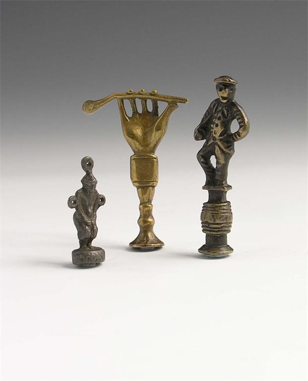 A Victorian brass pipe tamper, of a hand holding a pipe, the base stamped '4', 2 1/8in (5.4cm) h, another of a figure on a barrel and a lead example of a crouching man. (3)