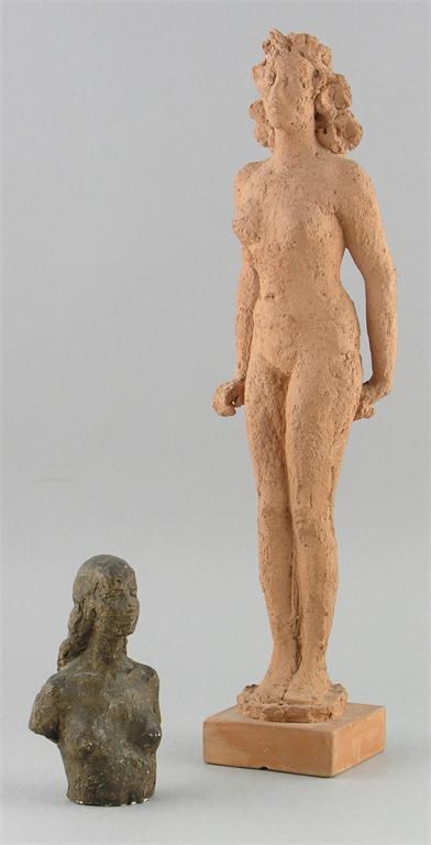Hermann Haller (1880 - 1950). A terracotta figure of a standing female nude, the square base inscribed 'H.Haller' 17in (43cm) h, and a plaster bust of a female, the base inscribed '242', 5.5in (14cm) h, together with four exhibition catalogues and studio photographs.