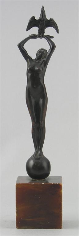 Francis Derwent Wood (1871 - 1926). A bronze figure of a female nude standing on a globe and holding a cockerel above her head, signed and dated 1897, 11.25in (28.5cm) h, on an alabaster plinth. Repairs to the cockerel.