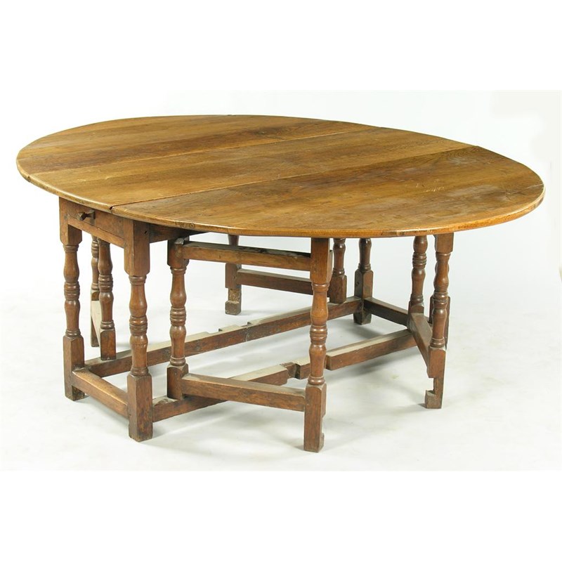 A double gateleg oak table, the oval top above end frieze drawers, on turned and block supports, incorporating 18th century elements, 29in (73.,6cm) h, 74in (188cm) open, 60in (152.4cm) d.