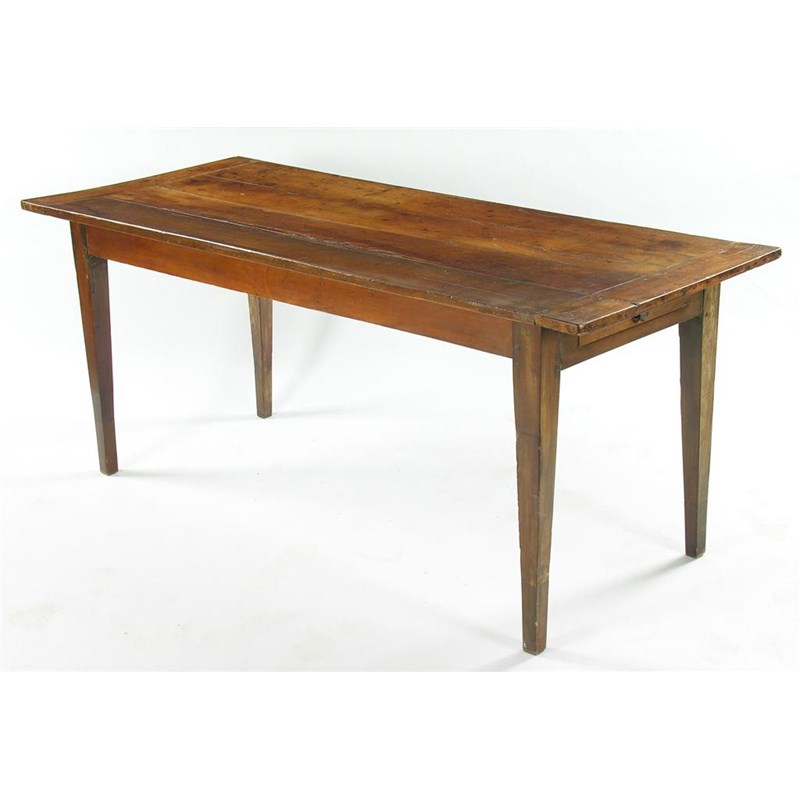 An early 19th century French fruitwood farmhouse table, the cleated boarded top above an end frieze drawer and a slide, 30in (76.2cm) h, 70.5in (179cm) l, 29.5in (75cm) w. The legs tipped, old restoration.